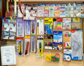 Várias opções na área da papelaria desde papel de embrulho, vegetal, esquiço, seda, manteigueiro, aguarela, EVA, cartolinas escolares, envelopes, rafia, entre outras. Contamos com uma seleção de cartões/postais para diferentes ocasiões como aniversários, baptizados, comunhões, casamentos.
